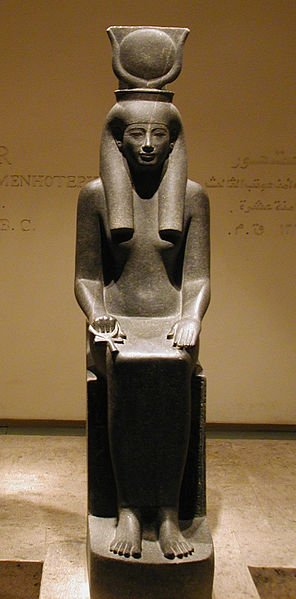 Continuing our exploration of the sacred trees of the goddess, we turn this week to the Egyptian goddess we know by the Greek name of Hathor. I had research to do for this, because I did not know why Hathor carries the title “Lady of the Sycamore” or why she had a shrine of sycamores in her city along the Nile. My first step was to learn more about the sycamore tree, and I quickly discovered that the tree known as “sycamore” in northern climates is unrelated to the sycamore of Africa and the southern Mediterranean. Hathor’s sycamore is the sycamore-fig, the earliest cultivated fig tree. Its fruit is orange-red, rounder than the common fig, and slightly less sweet. The milky juice of the unripened fruit is used medicinally for skin conditions. The fruit and the wasps pollinating the fruit attract a variety of birds. The tree is long-lived and grows along riverbanks to a height of about sixty feet, much larger than the common fig. The sycamore is a generous tree, offering its fruit year round.Hathor 1400 b.c.e.The association of the fig with Hathor evokes the idea of fig wine, as Hathor is a goddess of intoxication. Her new year rites were revels of dancing, music and wine, drawing large numbers of participants. Her priestess cult was an ecstatic one, with a strong emphasis on music. As Patricia Monaghan describes her,