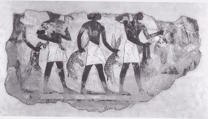 Wenut is considered an obscure goddess, and she gets little or no mention in my library of books on ancient Egypt, not even the books on animals or goddesses. Yet I have seen a fair number of leporids in Egyptian art, usually presented without explication. In some cases I am not sure that I’m really looking at a hare, because the desert foxes also have long ears, and the Jungle Cat is sometimes drawn with exaggerated ears to distinguish it from the Libyan Wildcat. Yet Egyptian drawing conventions are so standardized that I’m confident that most of these long-eared creatures are hares.Hare funerary offering. 1500 BCE.
