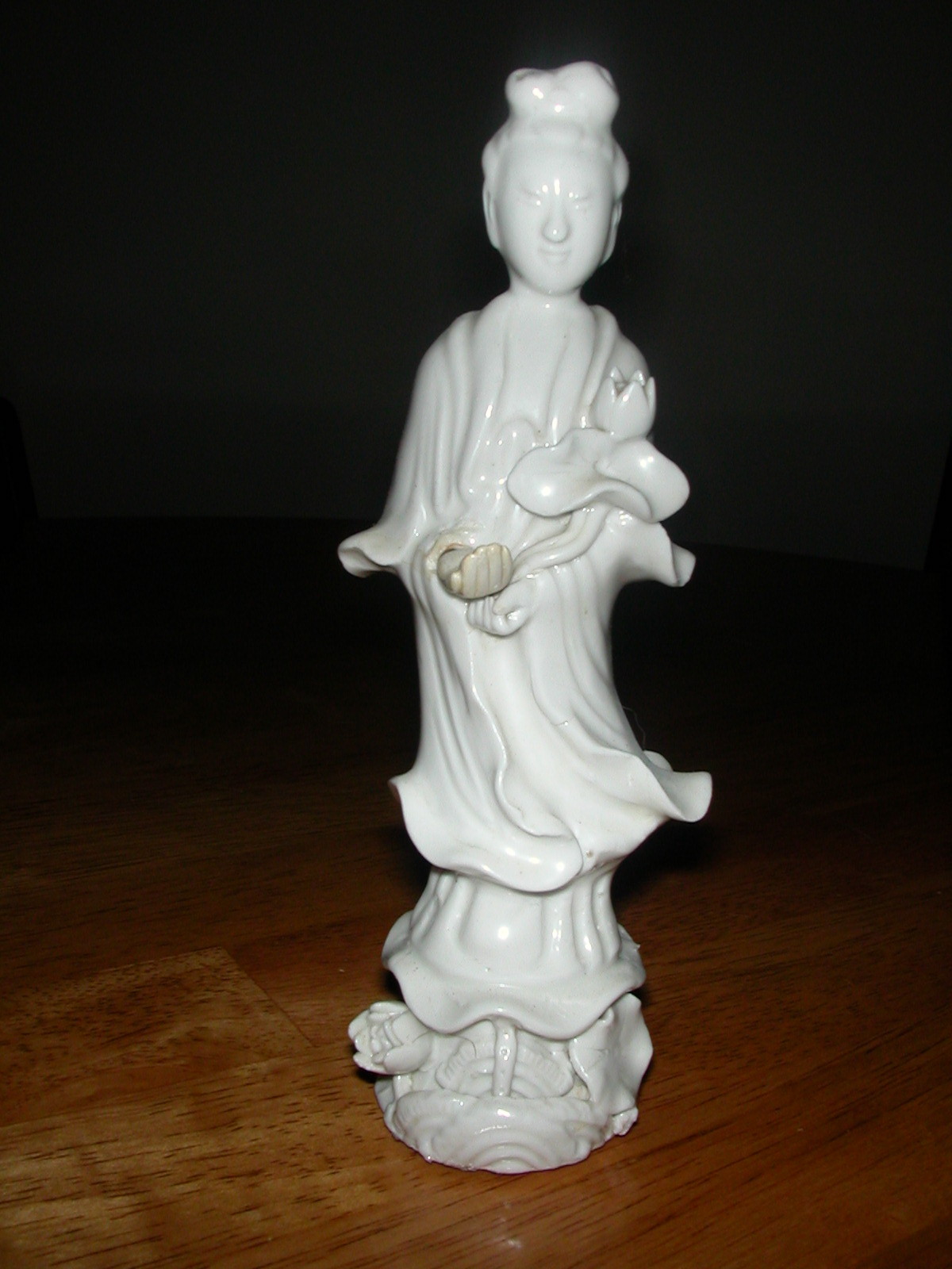 This is the statue of the goddess Kwan Yin which I have on my altar. It was given to me by a student after my first Kwan Yin statue was broken by my cat – not Samhain, the cat I had before her, Misha.I was very grieved by the loss of this statue, not only because Kwan Yin is an important goddess to me, but because the statue was given to me by a good friend I had lost touch with. Someone explained to me, however, that porcelain statues of Kwan Yin are expected to break eventually, and that I should take the statue to a temple rather than dispose of it myself.Knowing how devastated I was by these events, one of my students was excited to find a statue she thought was Kwan Yin at a garage sale. “I don’t know if this is Kwan Yin but I thought it might be,” she said. “But there’s a hole in it where one of the hands should be. We’ve been trying to figure out what that’s for.” I knew exactly what the hole was for, because my first statue had the same feature. The hole is for a detachable hand that is removed from the statue when making a request. The supplicant carries the hand around with her until the prayer is granted, then returns it to the goddess.Kwan Yin is the Chinese Buddhist goddess of mercy, “She who hears the cries of the world.” She is a complex and multifaceted goddess who has been the subject of much scholarship, particularly with the rebirth of the Goddess Movement. Even before this she had a sizable devoted following, among Westerners as well as Chinese. I first heard about Kwan Yin at a lecture given by the editor of a paper I worked on, Libby Gregory. In the dark ages before videos and the Internet, Midwesterners went to lectures for entertainment. I don’t know if it was a product of the big tent Christian revival experiences of the audience or if this is a common experience during discussions of Kwan Yin, but after Libby’s talk many people came forward and shared their miraculous experiences with Kwan Yin’s intervention. I was impressed.Because she introduced me to Kwan Yin, my feelings about this goddess are intertwined with my feelings about Libby. A small business owner and editor of the local left-wing paper, Libby was a driving force behind the progressive movement in our conservative town. To be honest I often thought of her as a bit of a nuisance, frequently calling me on the telephone requesting my services for hard journalistic assignments requiring a great deal of investigation. For some reason I almost always said yes, even though these assignments offered very little pay. It was another Kwan Yin miracle.Eventually I moved away to the West Coast and didn’t think too much about Libby. I liked her, but I certainly didn’t give her my new phone number. It was when I was back for one of my infrequent visits that I learned Libby had died several years earlier, killed in a plane crash. Although Libby had never been a huge figure in my personal life, I could not imagine the town without her. She was like the Olentangy River or the state university campus – she was a part of the community structure. Her loss left a hole that could not be replaced.It did not surprise me to learn that “killed in a plane crash” only told part of the story. Libby had stayed behind to help other passengers as the smoking plane was being evacuated, and so was one of the few who did not survive. We could wish she had left the burning aircraft while she had a chance, but if she had done that she wouldn’t have been the person she was.When I was ordained in the Fellowship of Isis, I was asked to make a pledge to three goddesses, one of which I would be “priestess of” and two more I would agree to serve. I chose Kwan Yin as one of my three goddesses. Not because of Libby exactly, but because of mercy.My student took the statue back home and asked her woodworking husband to make a new hand for it. I’ve always wondered about the missing hand, if someone prayed for something they wanted very much and the request was never granted. I hope by this time they have found recompense for their loss.